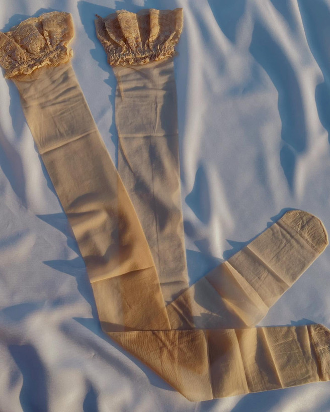 جوراب شیشه ای کرم بالای زانو پشت گیپور نوار ژله ای داره فری سایز تا ۴۲