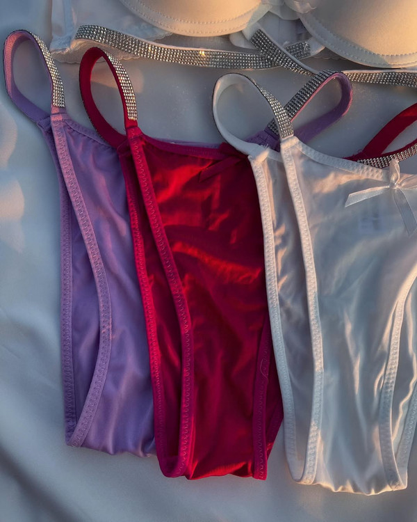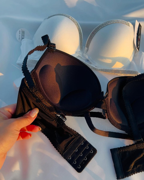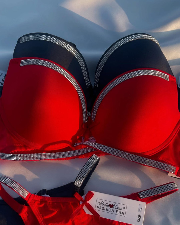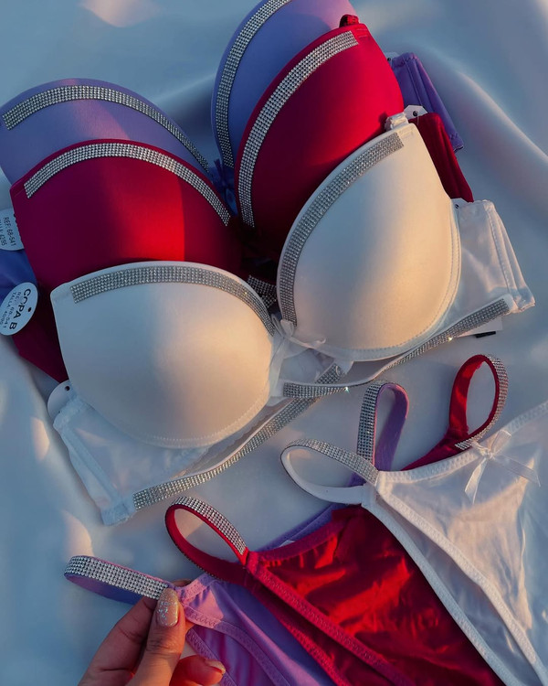 ست الماس سوتین فنر داره کاپ سوتین یه کم جک داره که صرفا جهت لیفت کردن سینه س فاق شورت نخیه شورتش هم دو تا سایز L. Xl. داره نگین ها به هیچ وجه نمیریزه سایزبندی سوتین ۸۰،۸۵،۹۰،سوتین اسفنجی هر سایزی میپوشی اینو یه سایز بزرگ تر سفارش بده کاپش ریزه)