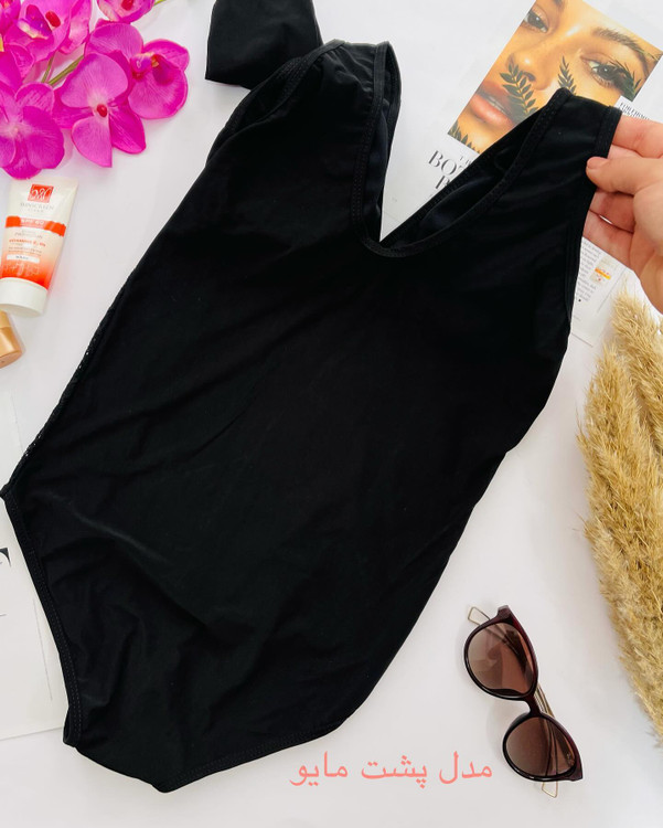 مایو کاملا مشکی بغل مایو گیپوریه کلاه هم داره مدل اسلیپ فاق مایو دولایه س کاپ دار